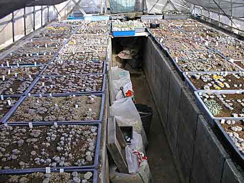こちらは生産用の温室です。実生後間もないものから、数年を経たものまでいろいろありました。左下の苗などは小石に見えませんか?