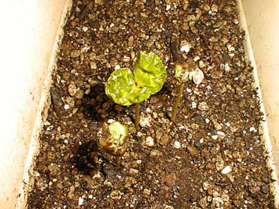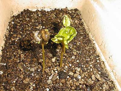 やっと殻を破って葉を広げはじめています。左右のコーヒー豆がはずれかかっています。