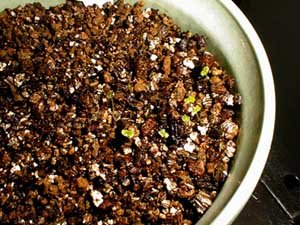 種まき後、水をあげて受け皿に水を張り、その上からビニール袋をかぶせて待つこと6日目で最初の発芽がありました。 |